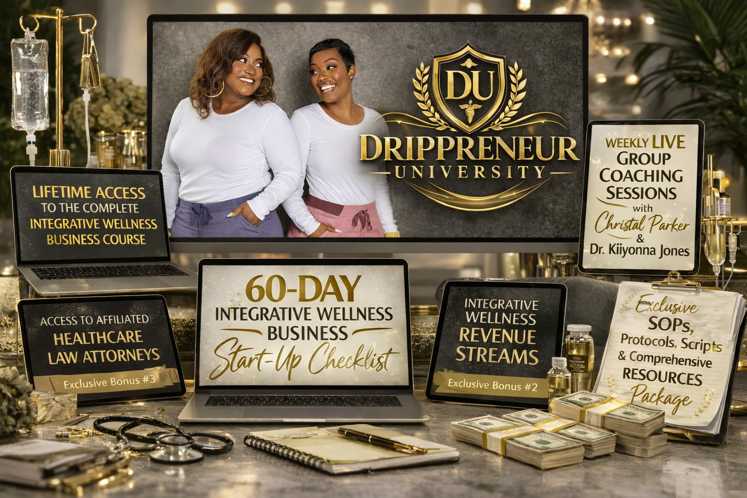 Exclusive Live 8-Hour Masterclass: Participate in an intensive, live masterclass, hosted in person and online. This interactive session is designed to equip you with the knowledge and skills to start your six-figure IV Hydration business and scale to an Integrative Wellness practice.